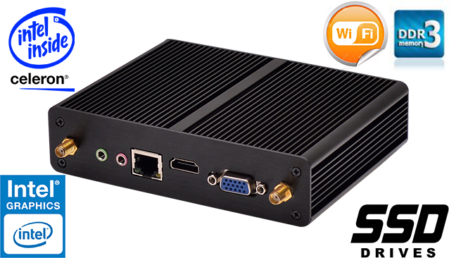 Using the latest technology Digital Engine (industrial fanless MiniPC) is designed for continuous multitasking operating with low power consumption. An important advantage is the effective combination of small size with considerable opportunities through the use of Intel's processor family, Intel chipset and DDR3 memory. Integrated Intel HD Graphics video and audio Realtek ALC662 allow you to play a wide range of applications and media files (video, audio) - in Full HD quality. Disks offer free space 16GB/32GB/64GB/128GB SSD.