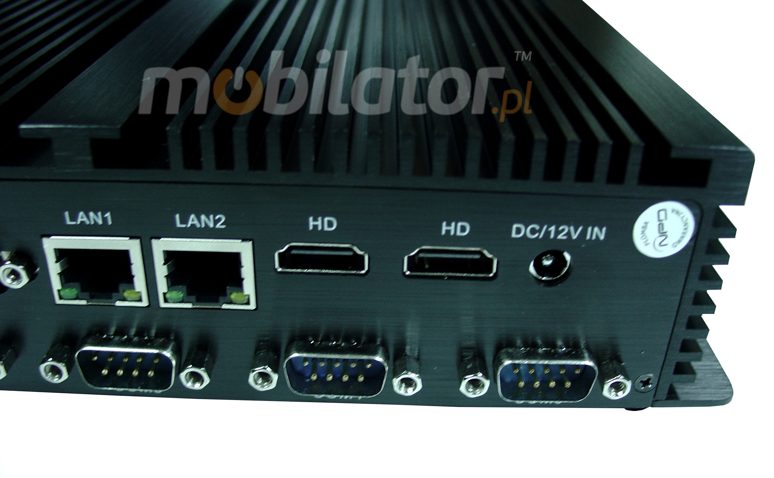 Integrated card - Intel 82574L Gigabit and the Wi-Fi module allow connection to the network. The computer is equipped with: two LAN ports,  two HDMI ports, four USB 3.0 ports, four USB 2.0 ports, six COM(RS232) ports, one Mic and one Speaker port and a built-in connector on the motherboard: SATA  port and mSATA port.