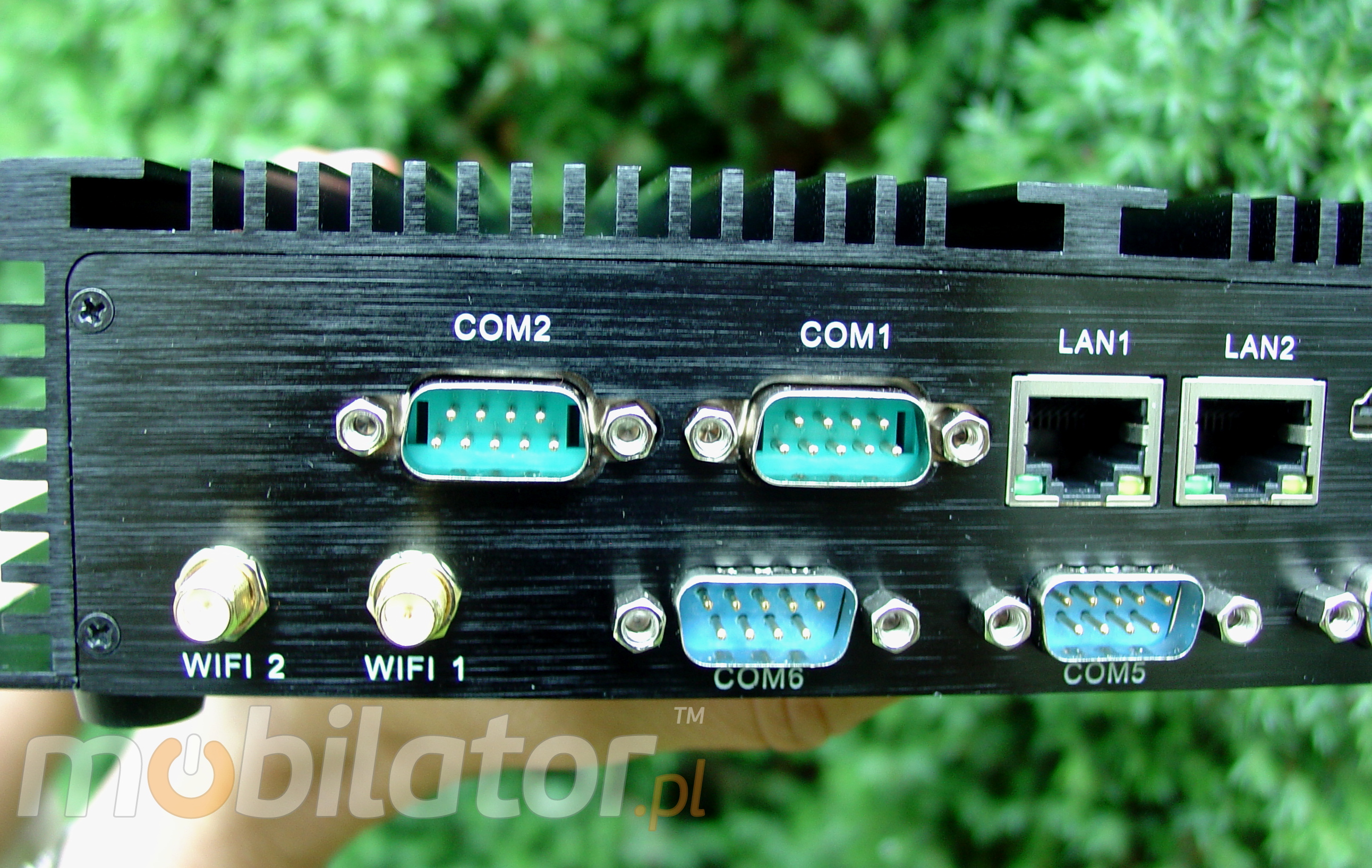 Integrated card - Intel 82574L Gigabit and the Wi-Fi module allow connection to the network. The computer is equipped with: two LAN ports,  two HDMI ports, four USB 3.0 ports, four USB 2.0 ports, six COM(RS232) ports, one Mic and one Speaker port and a built-in connector on the motherboard: SATA  port and mSATA port.