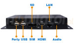 Integrated card10M/100M LAN and WiFi allow connection to the network andBluetooth module make possible to wireless data transfer. The computer is equipped with: one LAN port, two USB 2.0 ports, one HDMIoutput port, one Audio, one SD slot, one SIM card slot and Power On/Off.