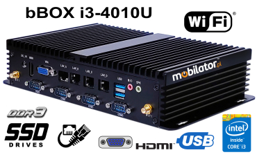Small dimensions industrial computers excel in environments where dust, dirt and moisture predominate. They are ideal for applications requiring quiet operation. Small and reliable MiniPC use heat-pipe technology and aluminum fins for passive cooling. The robust mini Industrial Computer bBOX i3-4010U is a device designed for all industrial and non-continuous applications requiring continuous operation - 24 hours, 7 days a week.