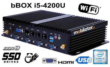 Small dimensions industrial computers excel in environments where dust, dirt and moisture predominate. They are ideal for applications requiring quiet operation. Small and reliable MiniPC use heat-pipe technology and aluminum fins for passive cooling. The robust mini Industrial Computer bBOX i5-4200U is a device designed for all industrial and non-continuous applications requiring continuous operation - 24 hours, 7 days a week.