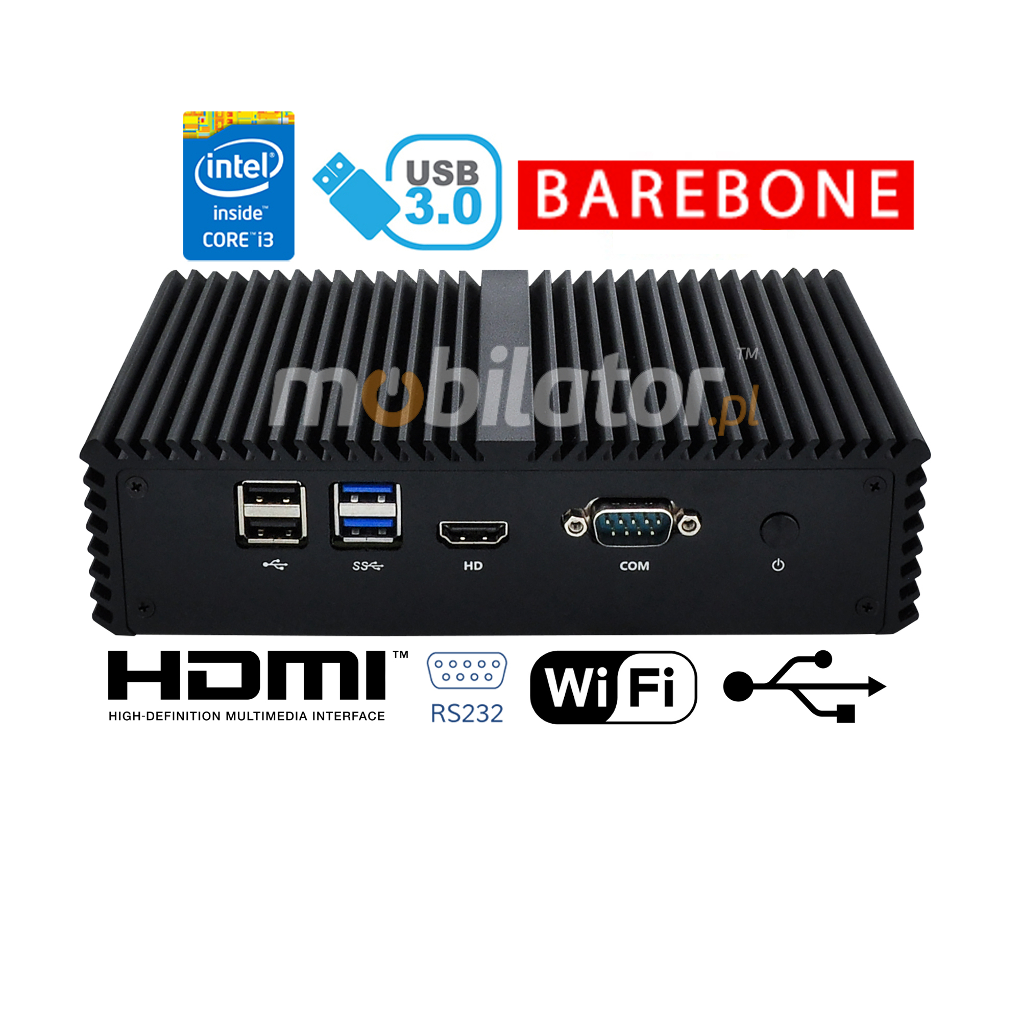 Small dimensions industrial computers excel in environments where dust, dirt and moisture predominate.They are ideal for applications requiring quiet operation.Small and reliable MiniPC use heat-pipe technology and aluminum fins for passive cooling.The robust mini Industrial Computer mBOX-Q5-510 is a device designed for all industrial and non-continuous applications requiring continuous operation - 24 hours, 7 days a week.
