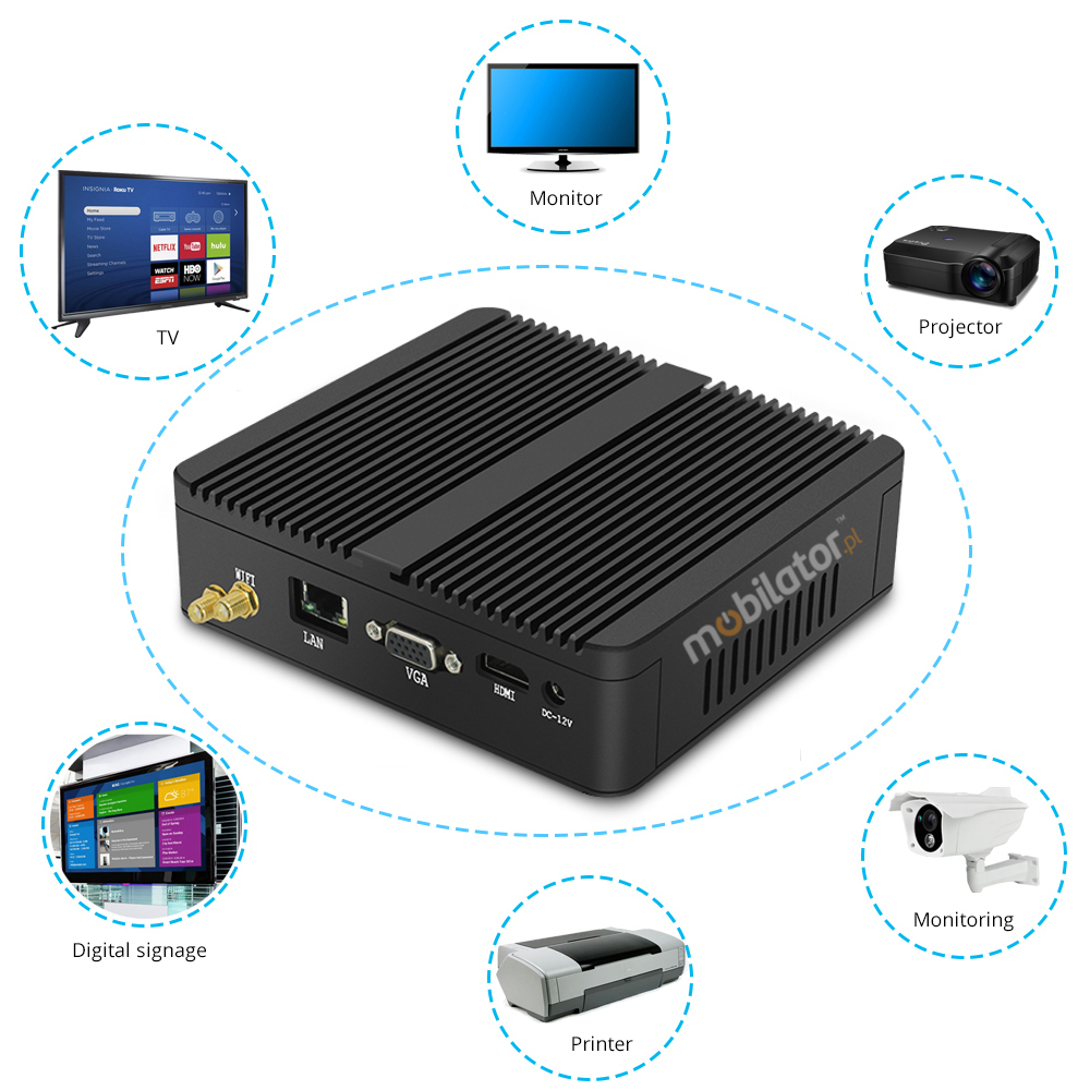 Mini PC is an ideal tool to support us in the implementation of many activities in the field of trade, small dimensions increase the possibility of its adaptation to activities such as issuing invoices or preparing documentation, which in turn allows us to convenient and optimal sales management.The VESA holder mounted to the housing provides many installation options, eg in stores (at the cash register, under the desktop, behind the LCD / LED monitor), in factory halls or in a delivery truck.