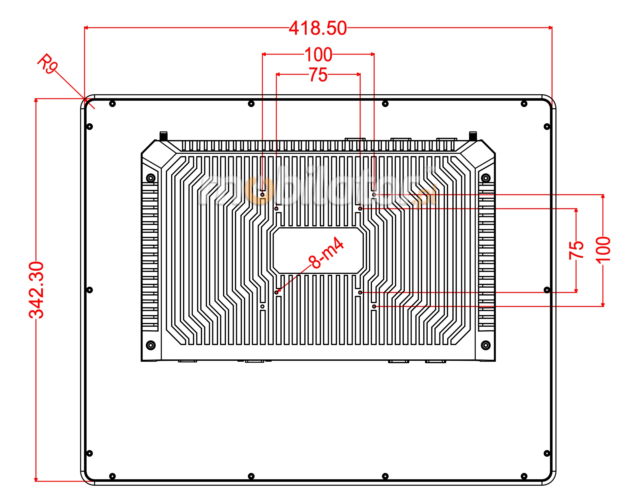 The durable BiBox 19-I58 industrial panel PC measures 425.5 × 349.3 × 52 mm and features a slim, space-saving design perfectly suited for control cabinets and limited industrial environments.
