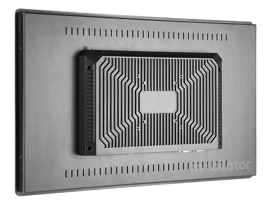 The panel PC has a good-quality metal casing. It is an important element of the cooling system thanks to specially designed cutouts that facilitate air circulation inside the housing. The overall design of the device is focused on simplicity and functionality, appreciated among professionals, as an accessory the panel can be equipped with passive cooling.