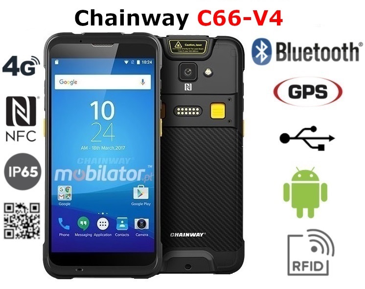 Chainway C66-V4 is a modern, waterproof industrial smartphone designed for extreme applications. It has a specially designed, reinforced construction that meets the requirements of IP65, which confirms the protection of the device against dust and water.