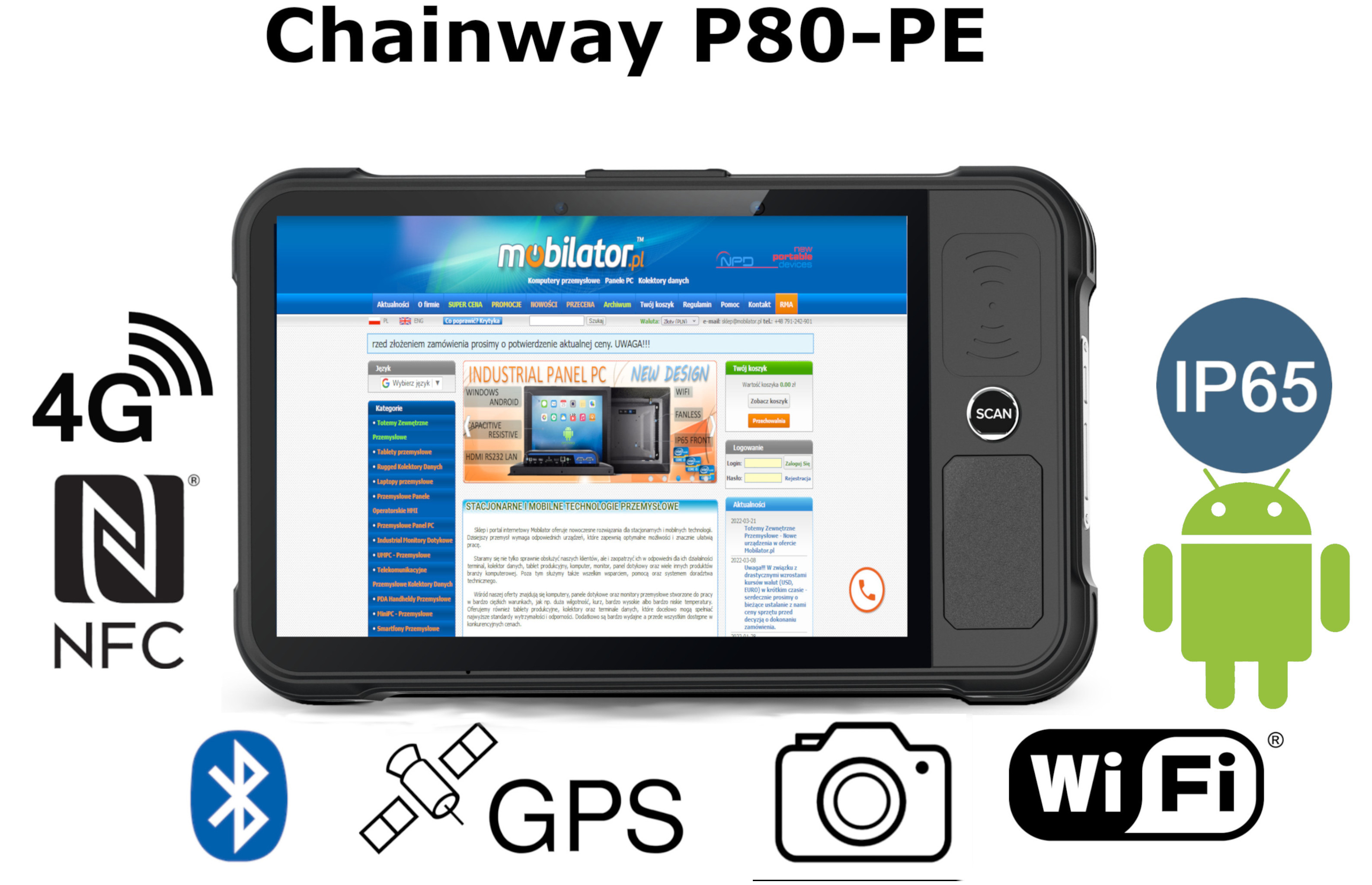 Chainway P80-PE is a modern, waterproof industrial tablet designed for extreme applications. It has a specially designed, reinforced construction that meets the requirements of IP65, which confirms the protection of the device against dust and water. It is also resistant to falls, even on hard surfaces.