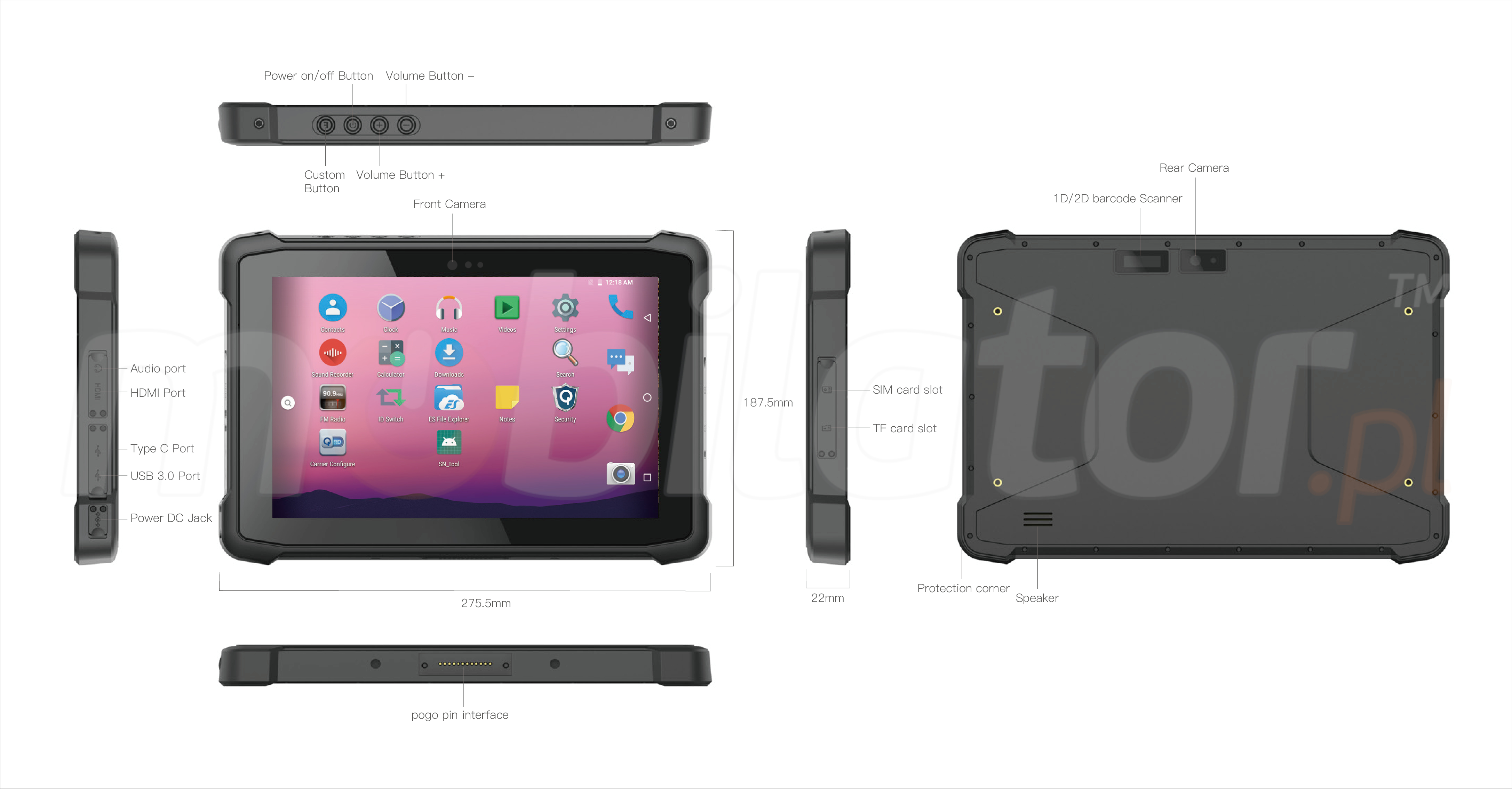 Emdoor Q11 is a modern, waterproof industrial tablet designed for extreme applications. It has a specially designed, reinforced construction that meets the requirements of IP65, which confirms the protection of the device against dust and water.