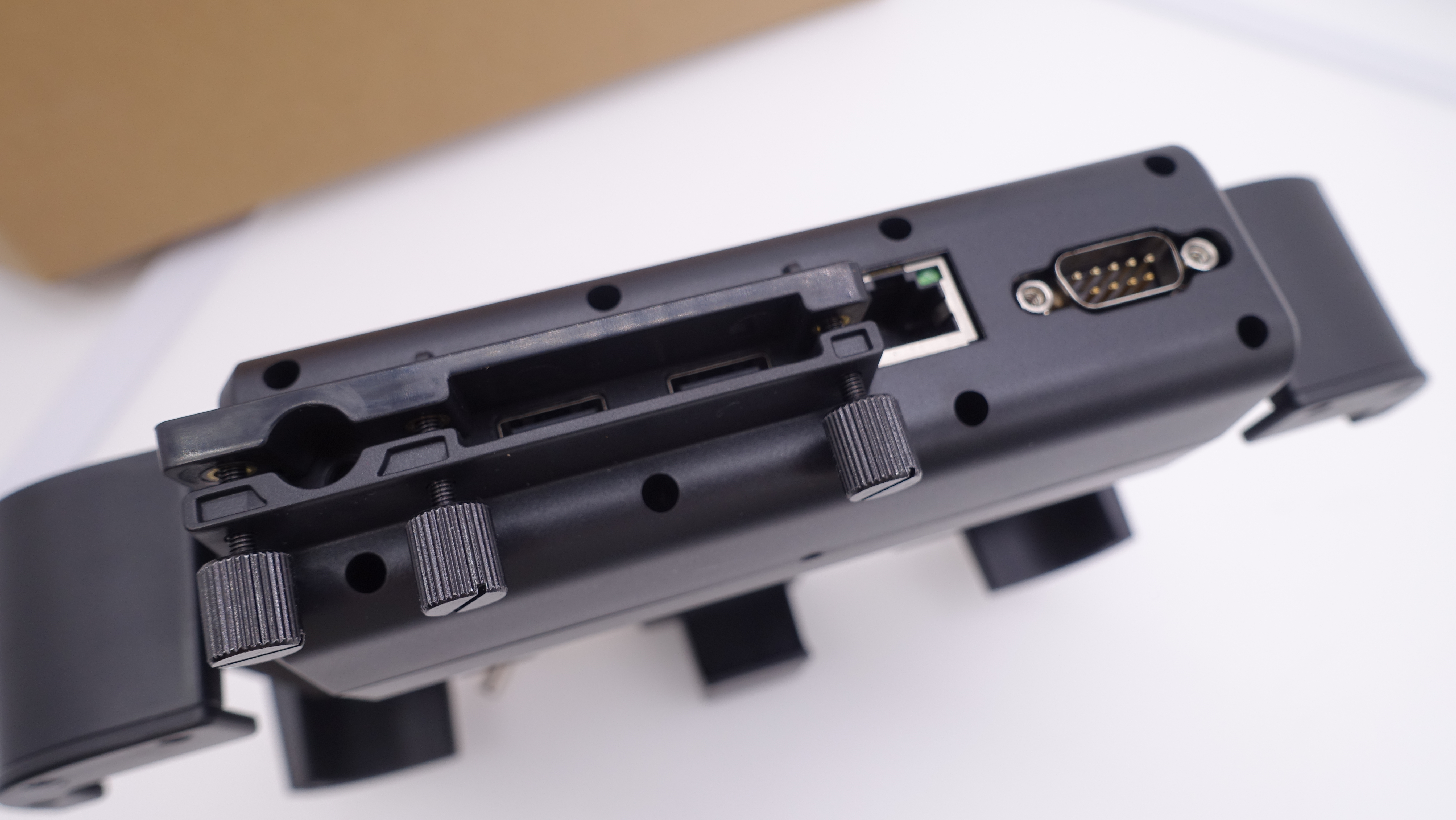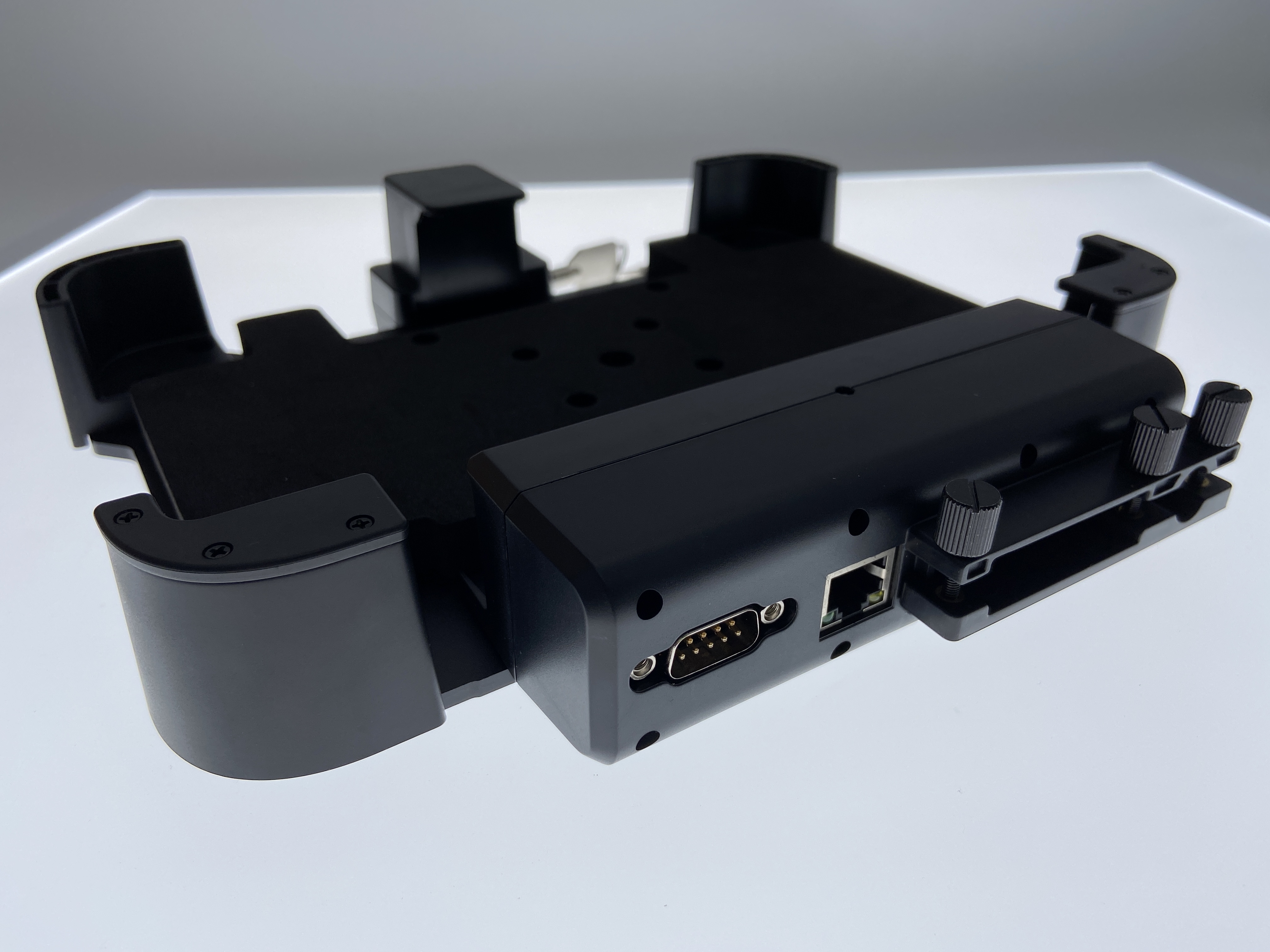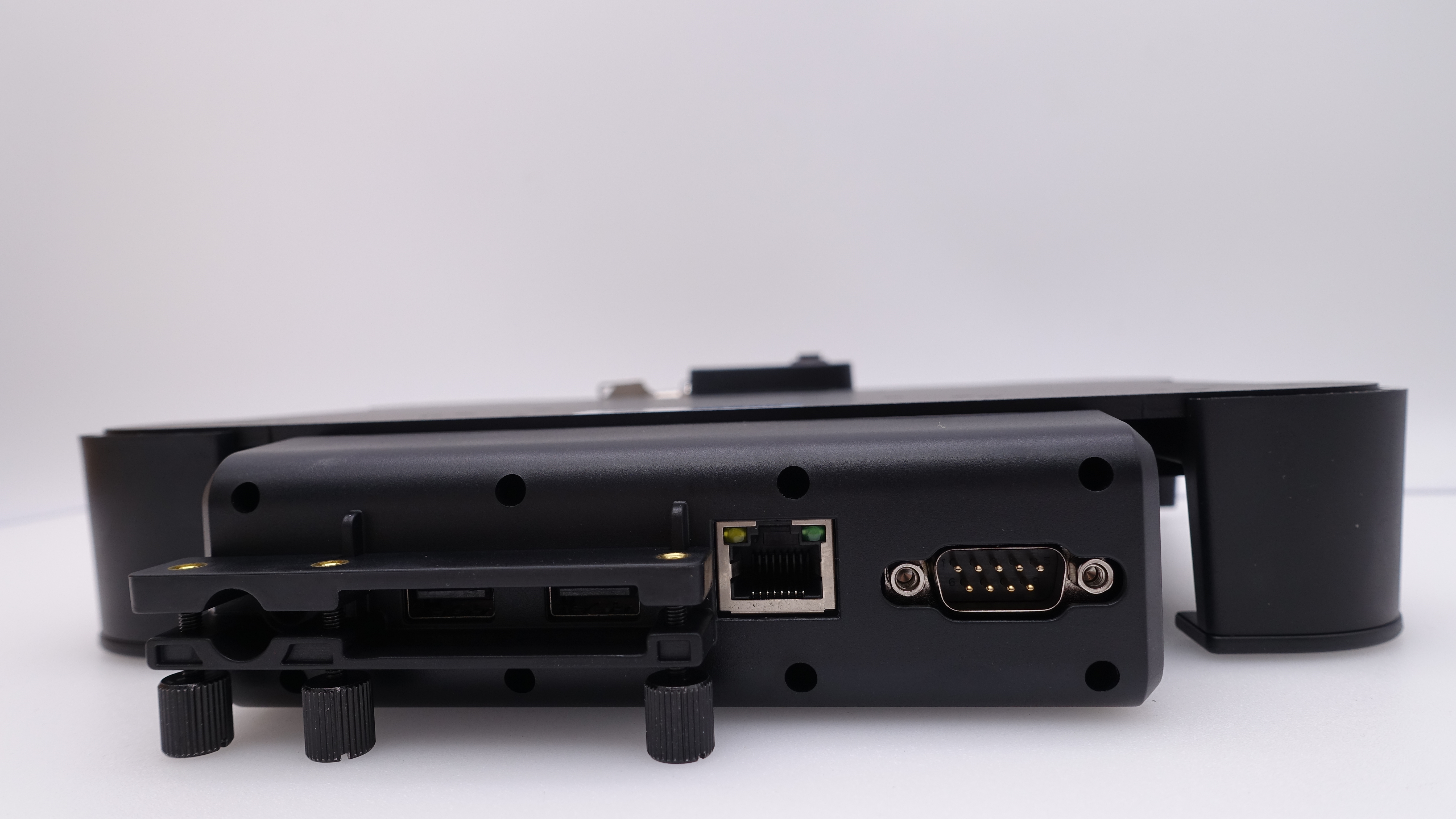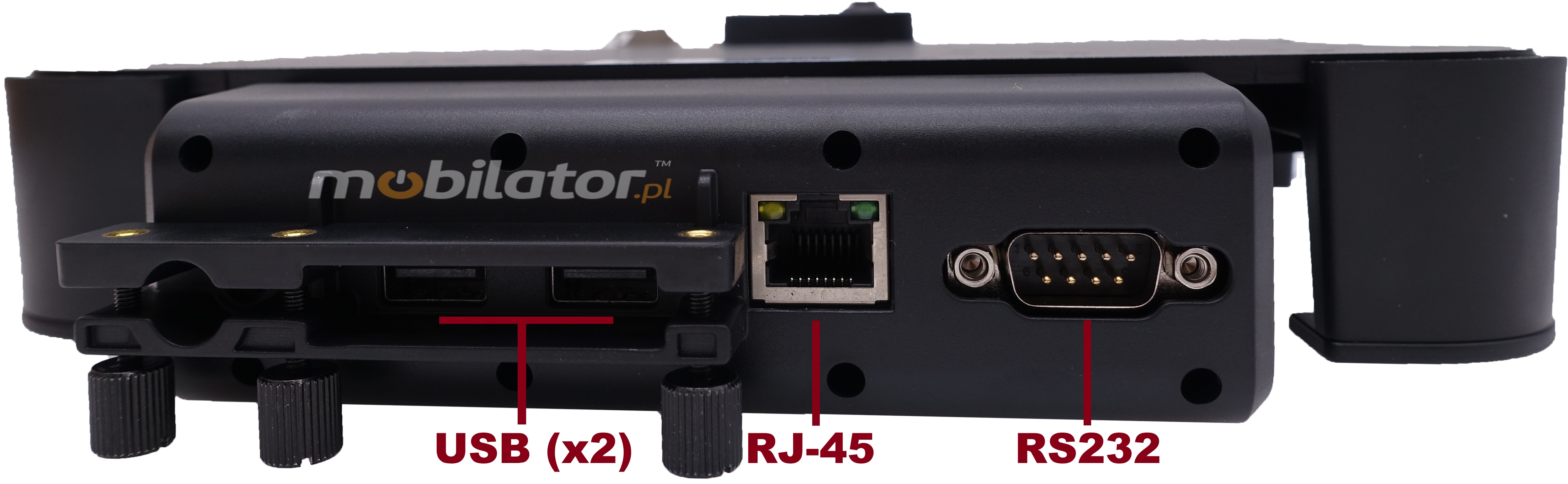 It is possible to use four different inputs/outputs in this holder: 1x RS232, 1x RJ-45 and 2x USB which are working after plugging DC.