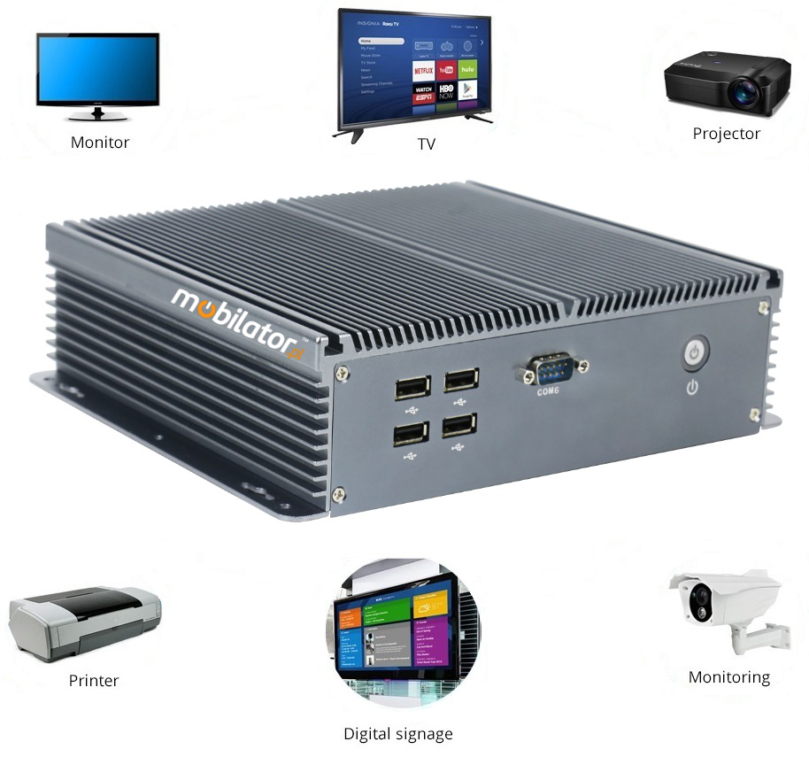 Mini PC is an ideal tool to support us in the implementation of many activities in the field of trade, small dimensions increase the possibility of its adaptation to activities such as issuing invoices or preparing documentation, which in turn allows us to convenient and optimal sales management.The VESA holder mounted to the housing provides many installation options, eg in stores (at the cash register, under the desktop), in factory halls or in a delivery truck.