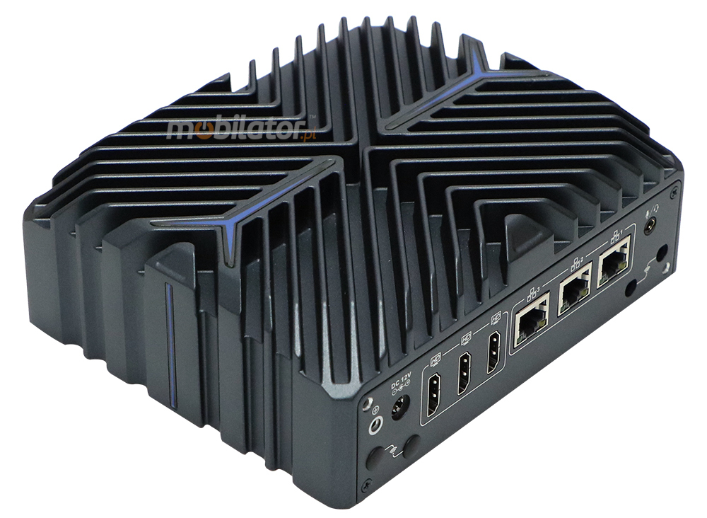 The industrial Mini PC also offers an active cooling option (fan), utilizing a fan to efficiently dissipate heat from the device's components. The fan directs heat outward, ensuring efficient cooling. Cooling fins aid this process by effectively dissipating accumulated heat. This system ensures optimal operating temperatures even under heavy load, ensuring stable operation in demanding conditions. Active cooling can be selected as an option when ordering the device, allowing for customization to individual user needs. The active cooling version features a slightly modified casing, adapted for fan installation and ensuring optimal airflow.