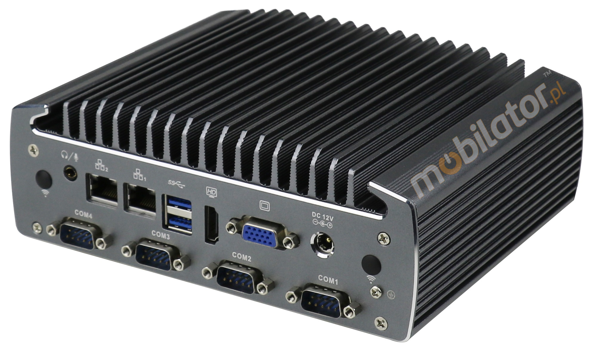 The industrial Mini PC uses a proven cooling system, based only on solid elements, mainly heat sinks.The system uses the phenomenon of metals passing thermal energy into the environment - there are no additional moving elements in the form of eg fans.This solution ensures noiseless operation, lower failure rate and greater protection against dust and other dirt while reducing the amount of energy consumed.