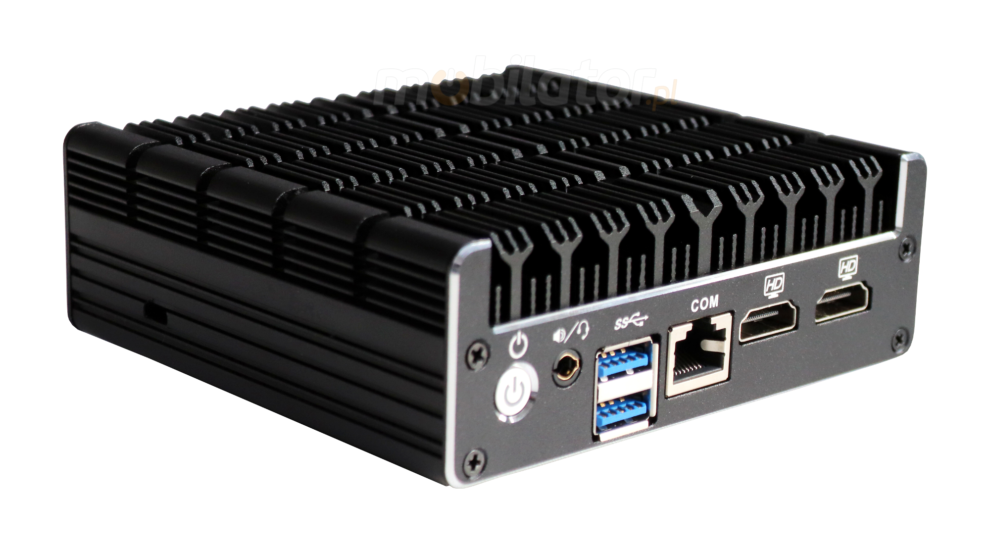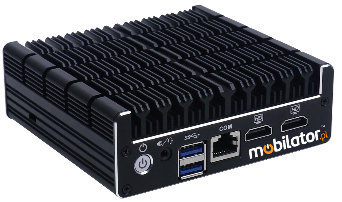The industrial Mini PC uses a proven cooling system, based only on solid elements, mainly heat sinks. The system uses the phenomenon of metals passing thermal energy into the environment - there are no additional moving elements in the form of eg fans. This solution ensures noiseless operation, lower failure rate and greater protection against dust and other dirt while reducing the amount of energy consumed.