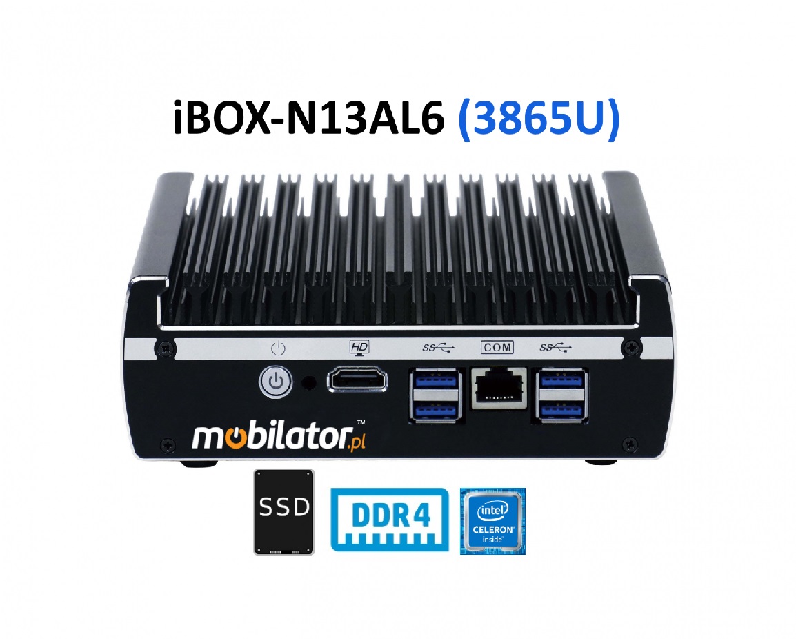 The industrial mini-computer iBOX-N13AL6 uses an efficient and energy-saving Intel Celeron 3865U processor. Inside it there are two cooperating cores enabling more efficient processing of many tasks at the same time. The shared cache memory in which the multilevel hierarchy is used is dynamically allocated to each processor core depending on the load. This reduces the average access time to the main memory. The implemented Virtualization Technology (VT-x) allows one hardware platform to function as multiple “virtual” platforms. It offers improved manageability by limiting downtime and maintaining productivity by isolating computing activities into separate partitions.