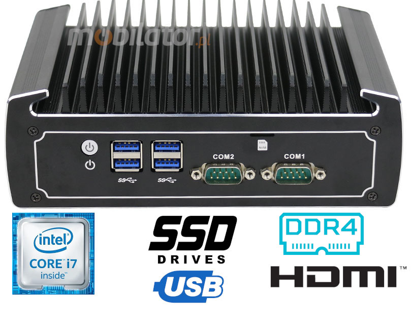 The industrial mini-computer IBOX N1574 uses an efficient and energy-saving Intel Core i7-8550u processor. Inside it there are four cooperating cores enabling more efficient processing of many tasks at the same time. The shared cache memory in which the multilevel hierarchy is used is dynamically allocated to each processor core depending on the load. This reduces the average access time to the main memory.