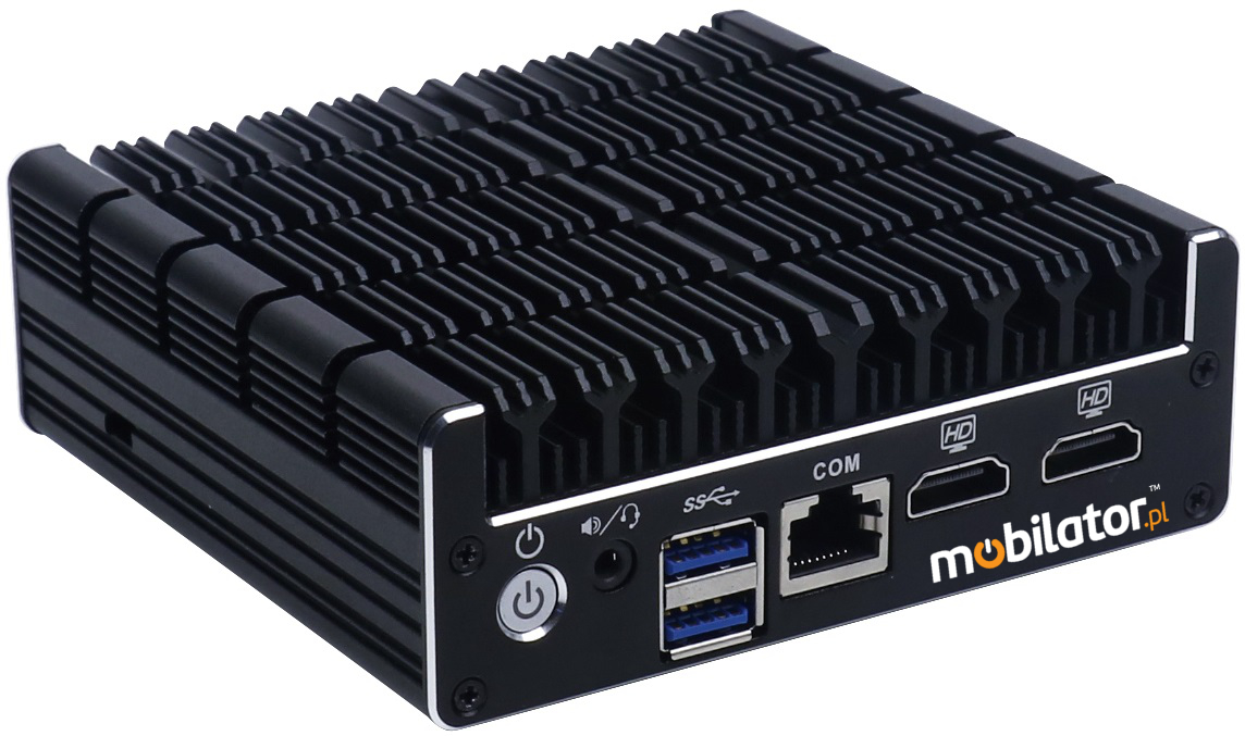 The industrial Mini PC uses a proven cooling system, based only on solid elements, mainly heat sinks.The system uses the phenomenon of metals passing thermal energy into the environment - there are no additional moving elements in the form of eg fans.This solution ensures noiseless operation, lower failure rate and greater protection against dust and other dirt while reducing the amount of energy consumed.