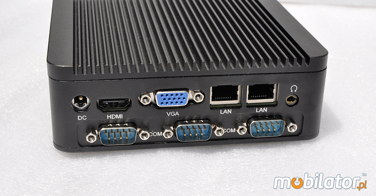 Integrated card - Intel RTL8111E LAN (optional WiFi module) allow connection to the network. The computer is equipped with: two LAN port, four COM (RS232) port, one VGA output, three USB 2.0 ports, one USB 3.0 port, one HDMI output one way audio, one microphone input.