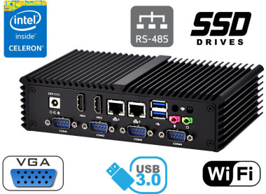 Two Integrated cards - Intel I211-AT- 10/100/1000 Controller allow connection to the network. The computer is equipped with: two LAN ports, two HDMI ports, two USB 2.0 ports, four USB 3.0 ports, four COM (RS232) port, one VGA port, one COM (RS485), one Audio input and one Mic output.