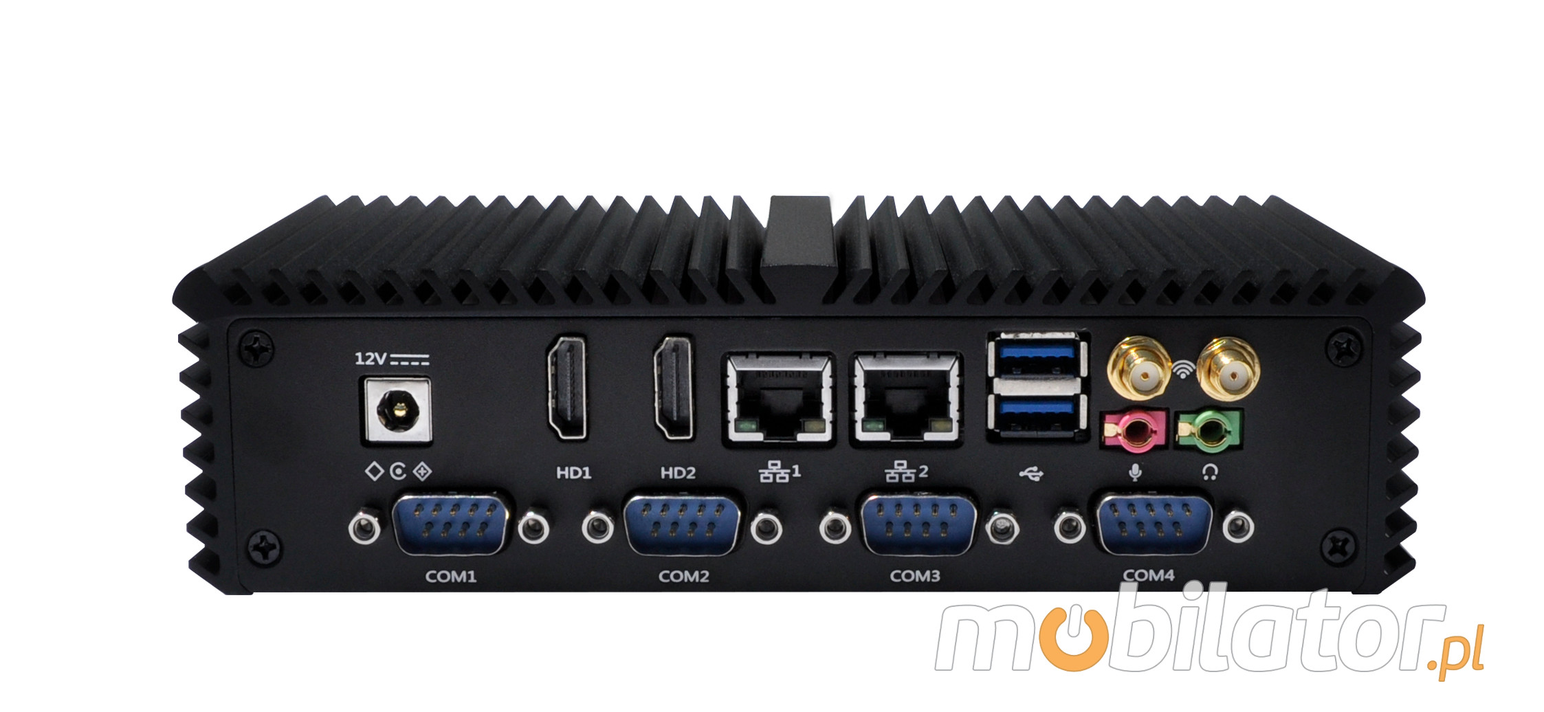 Two Integrated cards - Intel I211-AT- 10/100/1000 Controller allow connection to the network. The computer is equipped with: two LAN ports, two HDMI ports, twoUSB 2.0ports, four USB 3.0 ports, four COM (RS232) port, one VGA port, one COM (RS485), one Audio input and one Mic output.