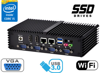 Two Integrated cards - Intel I211-AT- 10/100/1000 Controller allow connection to the network. The computer is equipped with: two LAN ports, two HDMI ports, two USB 2.0 ports, four USB 3.0 ports, five COM (RS232) port, one VGA port, one Audio input and one Mic output.