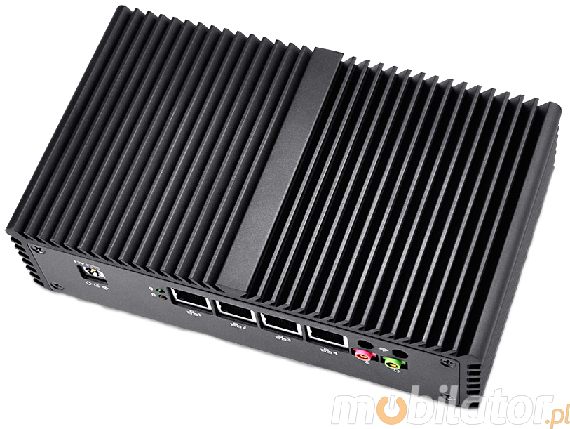 The Industrial Computer Fanless MiniPC mBOX Nuc Q355G4 uses a special method of cooling. This cooling takes place mainly by means of housing having a very large surface (longitudinal lamells, ribs) - for heat dissipation. Fan used inside the computer is designed to rapidly drain hot air from the CPU, allowing MiniPC to reach more efficiently and faster cooling.