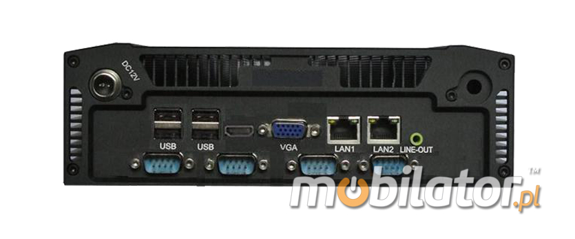 Integrated card - Intel 1000M Lan RTL8111E allow you to connect the device to the network. The computer is equipped with: two connectors LAN, four COM ports (RS232)- optionally one COM port can be replaced with a COM (RS485), one VGA output, four USB 2.0 ports, one HDMI output, one audio input.