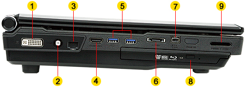 3x USB 3.0 ports (1 x powered USB port), 2x USB 2.0 ports, 1x eSATA port (powered USB3.0 AC/DC combo), 1x Mini IEEE 1394b port , 1x Display port (Reversion depends on Video Controller), 1x DVI-I output port (Single link), 1x HDMI™ output port (with HDCP), 1x Headphone jack, 1x Microphone jack, 1x S/PDIF output jack, 1x Line-in jack, 1x RJ-45 LAN port, 1x DC-in jack