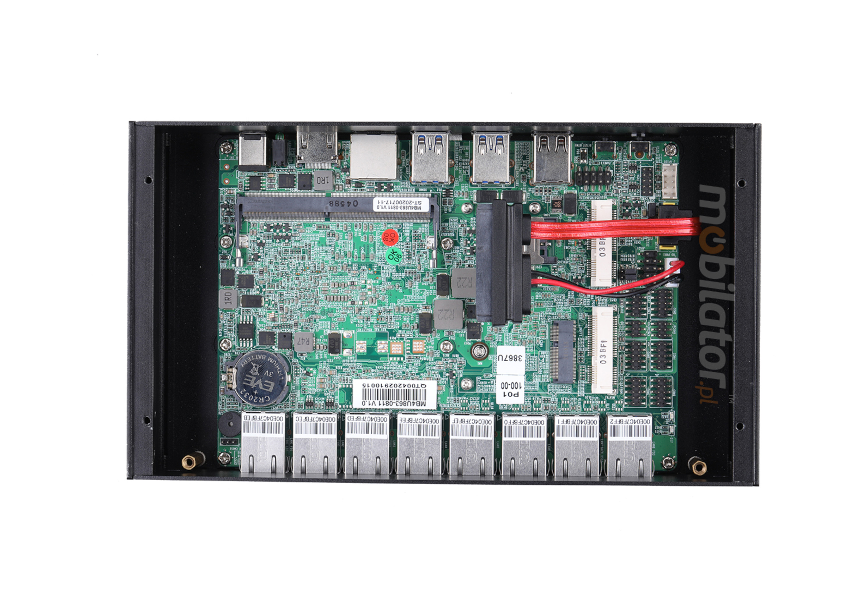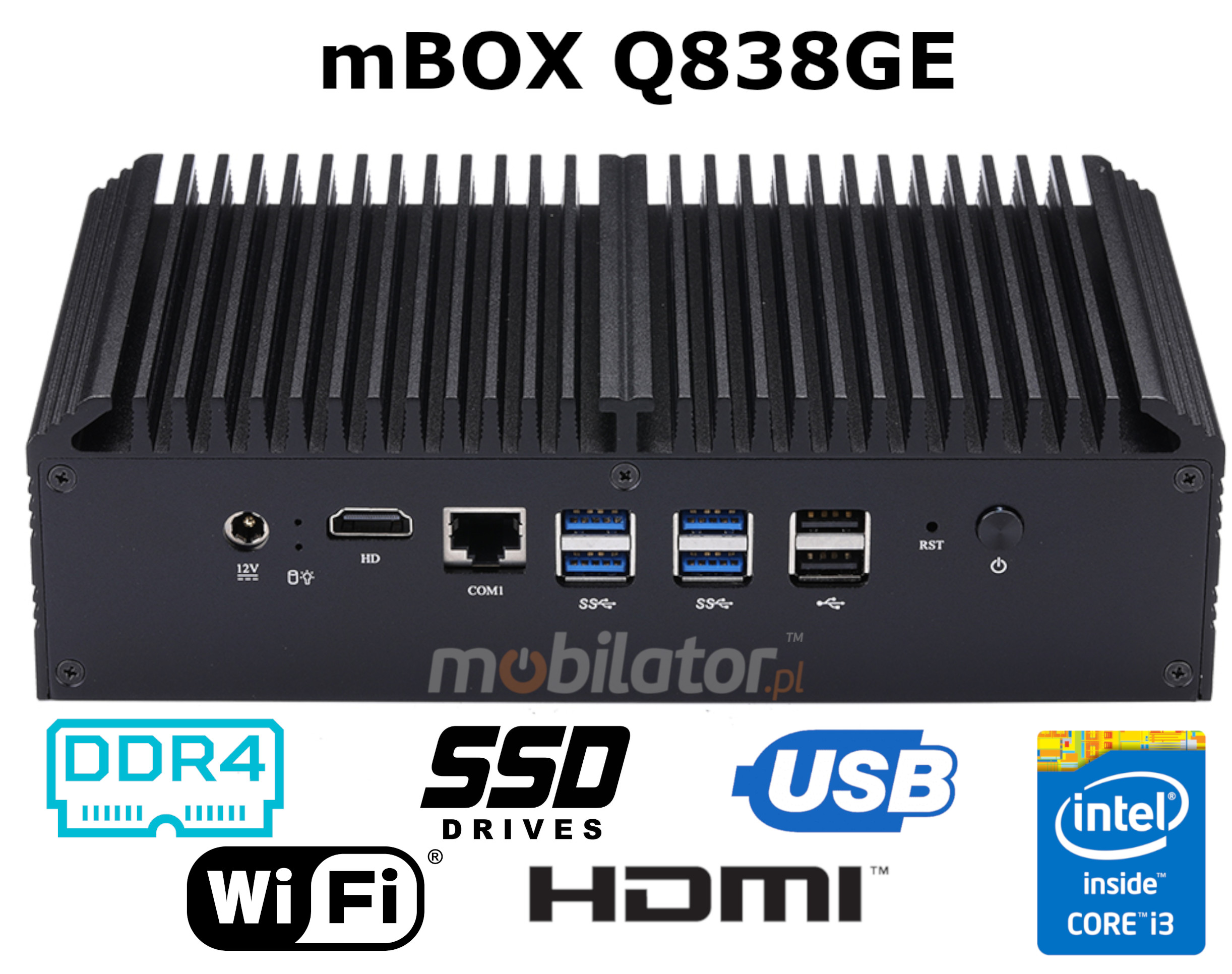 The passive cooling system used in the MiniPC mBOX Q838GE combined with the SSD disk makes this computer very resistant to various types of mechanical injuries. An additional advantage of industrial computers is a solid construction made of high quality aluminum and specially designed in such a way that in addition to high efficiency in heat dissipation, it can also resist any external damage.