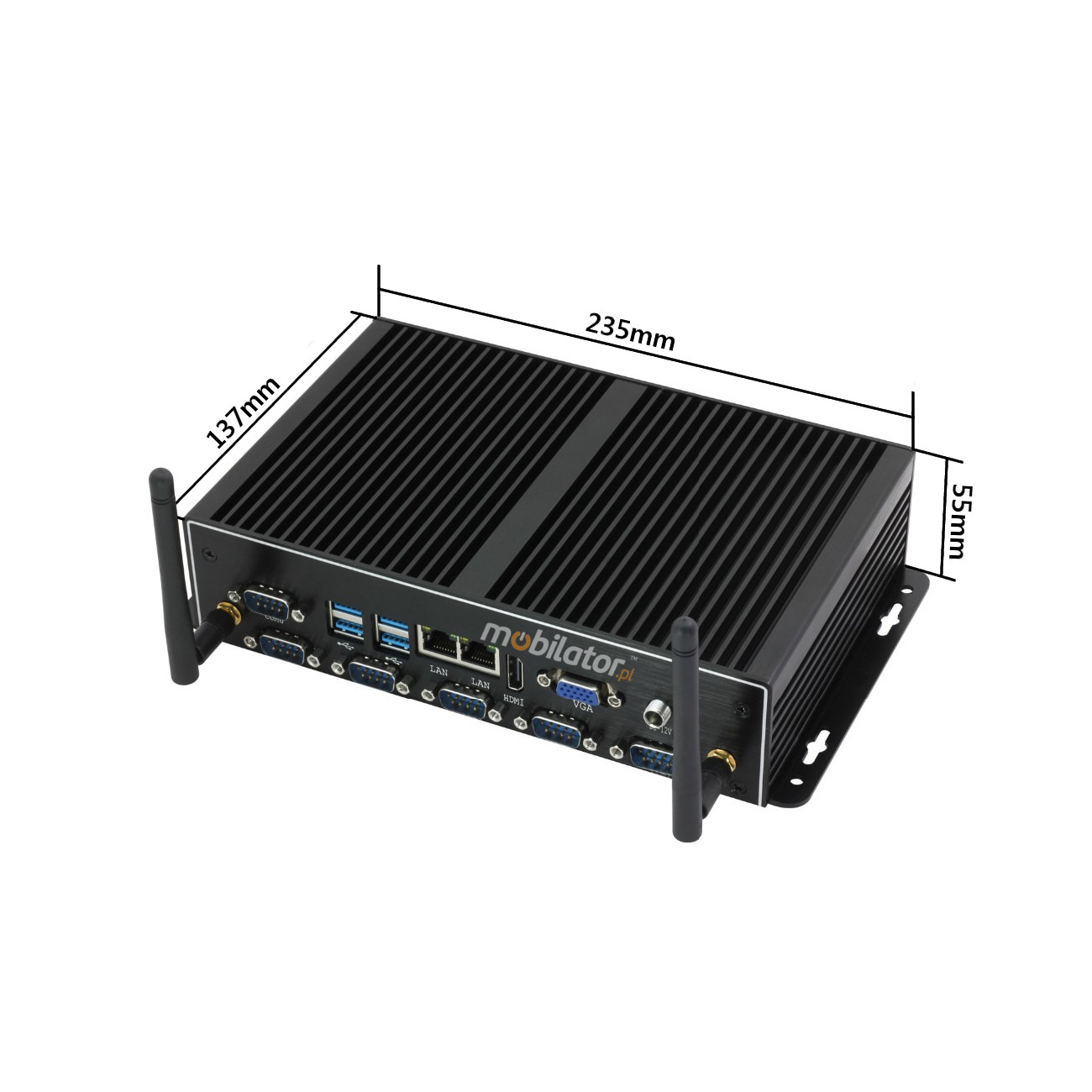 The industrial Mini PC uses a proven cooling system, based only on solid elements, mainly heat sinks.The system uses the phenomenon of metals passing thermal energy into the environment - there are no additional moving elements in the form of eg fans.This solution ensures noiseless operation, lower failure rate and greater protection against dust and other dirt while reducing the amount of energy consumed.