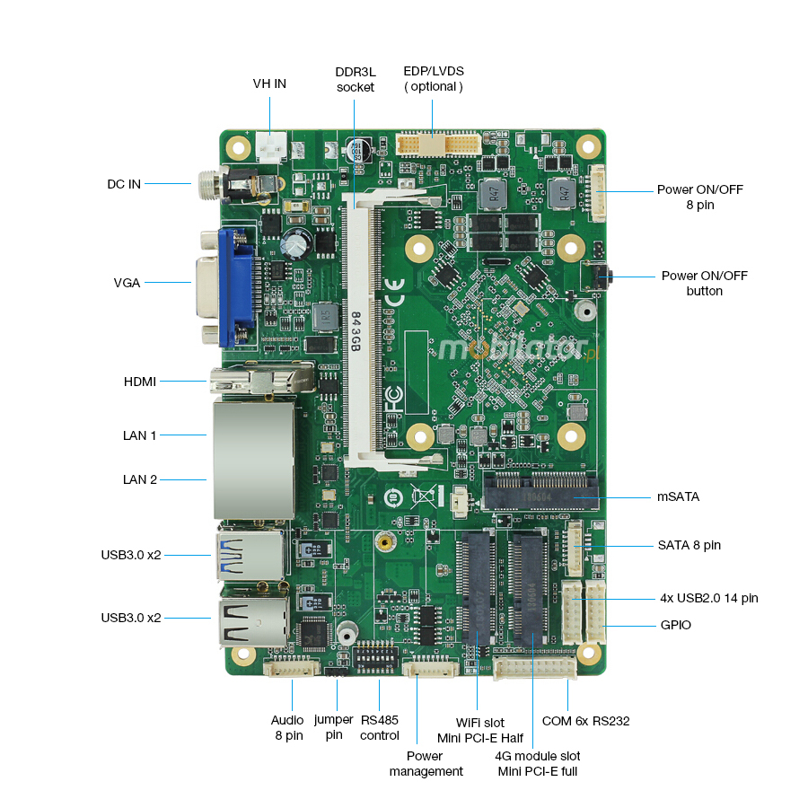 The industrial Mini PC uses a proven cooling system, based only on solid elements, mainly heat sinks.The system uses the phenomenon of metals passing thermal energy into the environment - there are no additional moving elements in the form of eg fans.This solution ensures noiseless operation, lower failure rate and greater protection against dust and other dirt while reducing the amount of energy consumed.