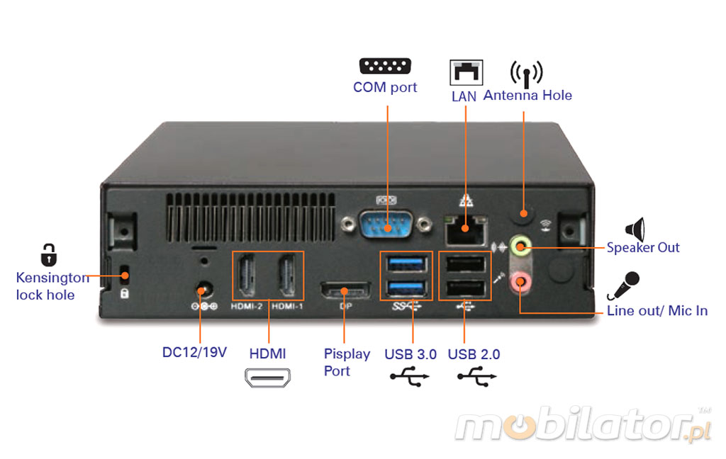 Realtek 10/100/1000 Gigabit Ethernet or WiFi adapter (optional) to connect the device to the network. The computer is equipped with: LAN connector, one COM port (RS232), four USB 2.0 ports, two USB 3.0 ports, two HDMI outputs, one Display Port two audio inputs, and optional WiFi, Bluetooth.
