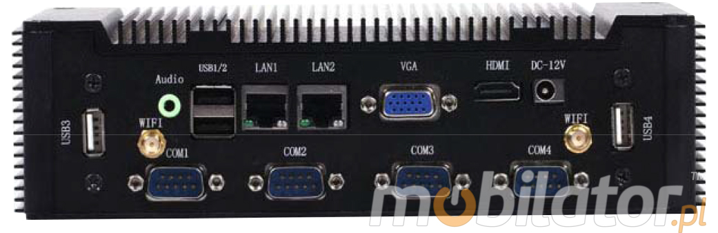 Integrated card - Intel RTL8111E 100M and WiFi module allow connection to the network. The computer is equipped with: two LAN ports, four COM ports (RS232), one VGA output, four USB 2.0 ports, one HDMI output one way audio, one microphone input.