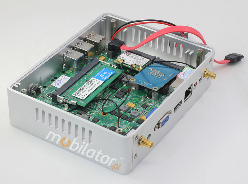 The industrial Mini PC uses a proven cooling system, based only on solid elements, mainly heat sinks. The system uses the phenomenon of metals passing thermal energy into the environment - there are no additional moving elements in the form of eg fans. This solution ensures noiseless operation, lower failure rate and greater protection against dust and other dirt while reducing the amount of energy consumed.