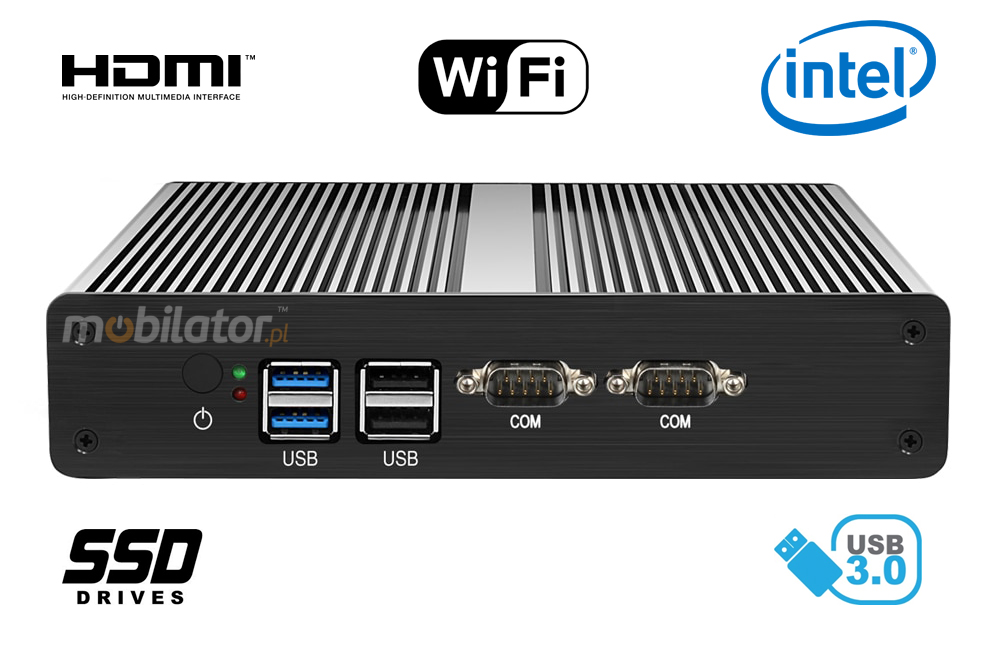 The industrial Mini PC uses a proven cooling system, based only on solid elements, mainly heat sinks.The system uses the phenomenon of metals passing thermal energy into the environment - there are no additional moving elements in the form of eg fans.This solution ensures noiseless operation, lower failure rate and greater protection against dust and other dirt while reducing the amount of energy consumed.