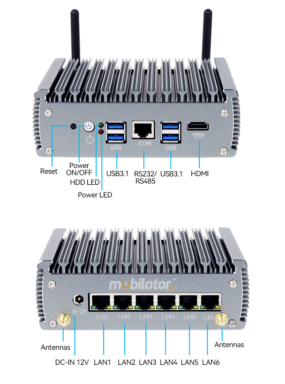 The passive cooling system used in the MiniPC yBOX-X56 make this computer very resistant to various types of mechanical injuries. An additional advantage of industrial computers is a solid construction made of high quality aluminum and specially designed in such a way that in addition to high efficiency in heat dissipation, it can also resist any external damage.