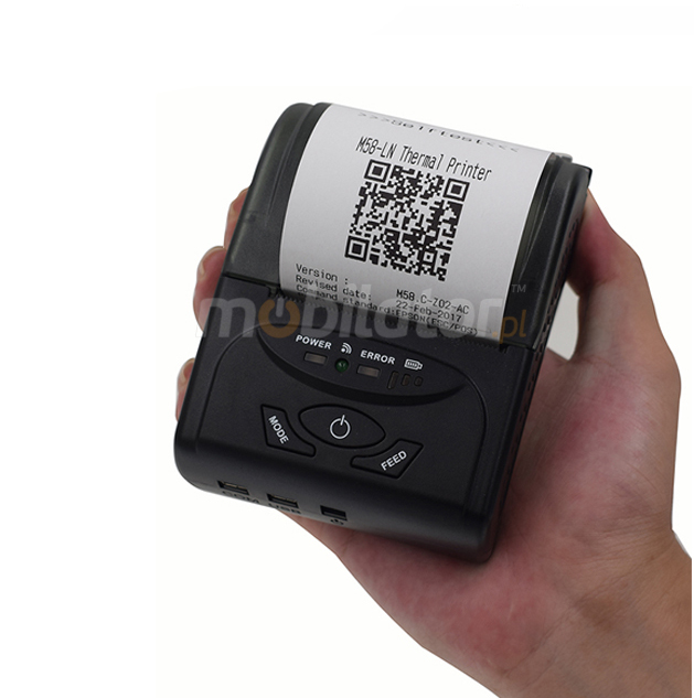 Easy loading paper roll "Drop-In & Print", high print quality, fast printing (up to 90mm/s), printing on thermal paper rolls of a width of 58mm makes the printer is applicable in a variety of mobile applications. The printer also are distinguished front panel, on which are placed the LEDs to indicate battery charge status, current or confirm the connection to the proper devices (smatphone, tablet, desktop computer, etc.). This multiplicity of functions makes the printer is user-friendly and ideal for field use thanks to the Bluetooth module.
