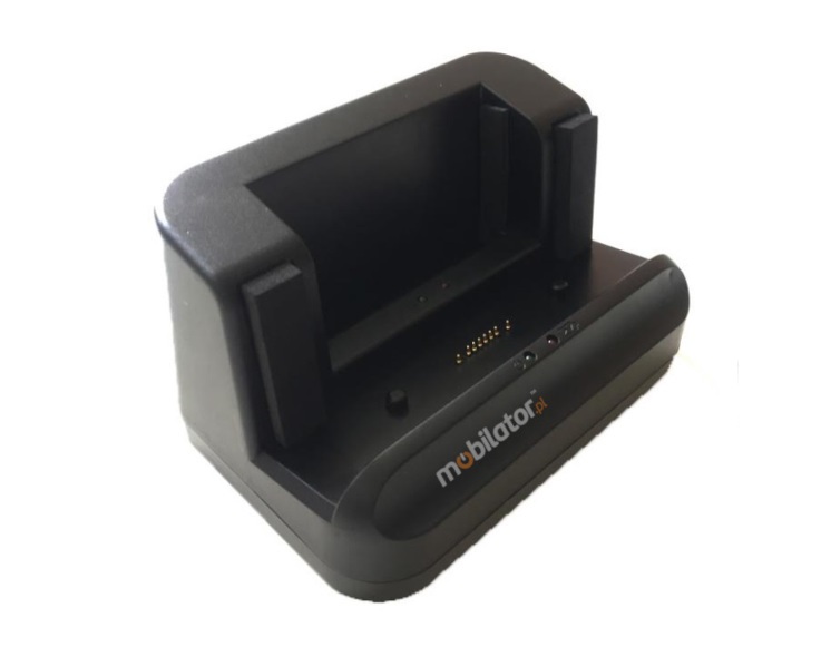 Docking station  for MobiPad's industrial rugged tablets make possible to charge battery inside of device and additional one in the same time. To improve functionality  there is two USB ports and RJ-45 and RS232.