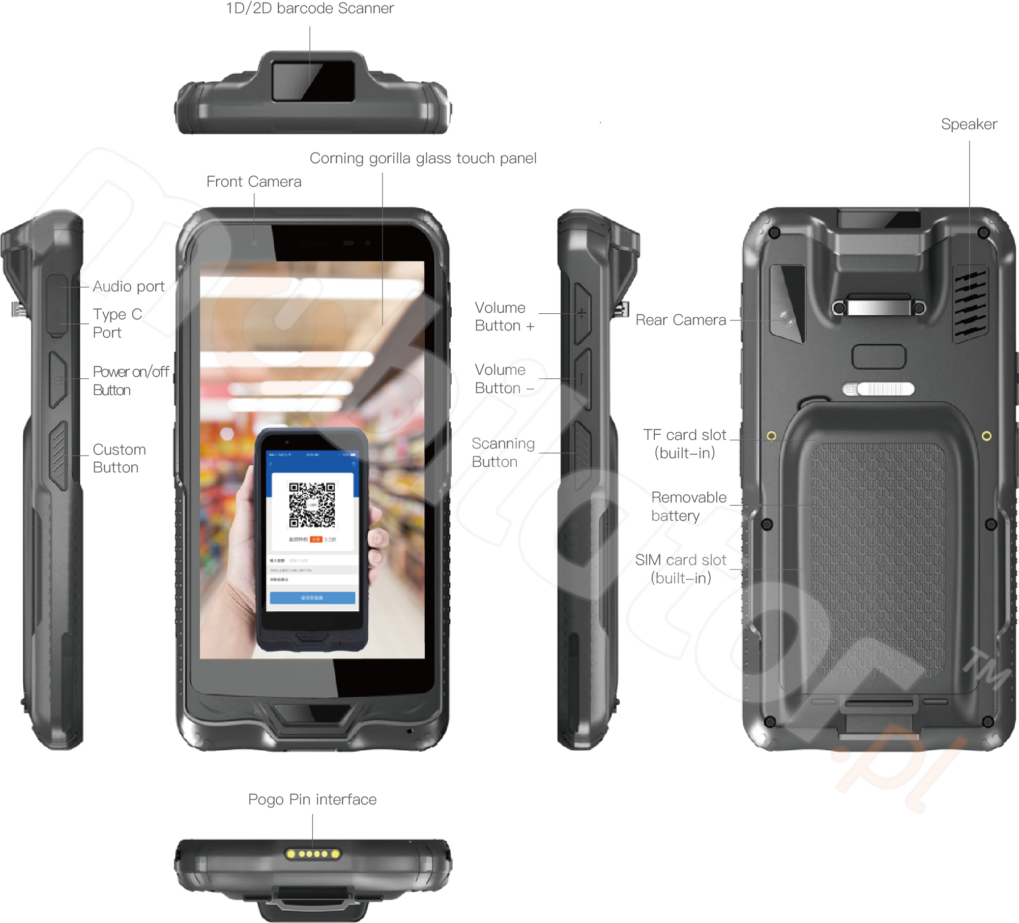 Mobipad Qxtron 6600 can optionally be equipped with docking station, scan trigger, straps, adaptor 3 in 1 and TP protective film.