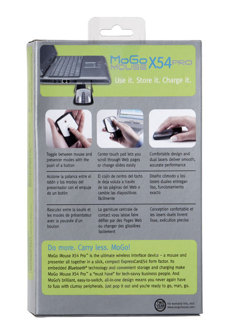 MoGo Presenter Mouse X54™ is a combined wireless presenter and mouse that stores and charges inside your laptop’s ExpressCard/54 slot – a “must have” for every laptop. The sleek design and size make it ideal for business travelers. It includes the same functionality as conventional laser wireless mice – scroll, right click, left click – without the bulky, oversized design. With the push of a button, your MoGo Presenter Mouse X54™ turns into a wireless presenter – allowing you to control your PowerPoint presentations with 30 feet of freedom. It features a slide changer, start/escape button and laser pointer. MoGo Presenter Mouse X54™ is compatible with laptop"s that are equipped with PCI Express slots, or Express Card 54 Slot.