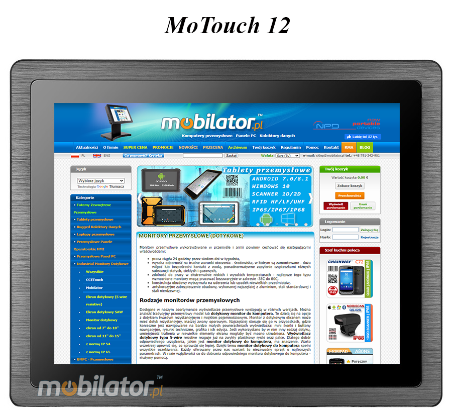 Touch monitor MoTouch 12 is adapted for continuous operation in both very low and high temperatures in the range from -10 ° C to 60 ° C. If the device is switched off, it can already handle temperatures between -20 ° C and 70 ° C. In addition, the durable PanelPC is perfect for rooms with increased humidity, ensuring proper functioning even in the case of 95% relative humidity.