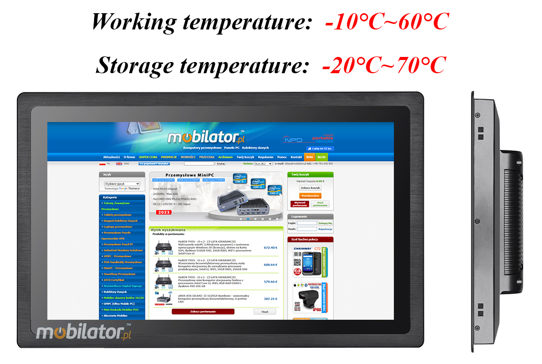 Touch monitor MoTouch 185 is adapted for continuous operation in both very low and high temperatures in the range from -10 ° C to 60 ° C. If the device is switched off, it can already handle temperatures between -20 ° C and 70 ° C. In addition, the durable PanelPC is perfect for rooms with increased humidity, ensuring proper functioning even in the case of 95% relative humidity.