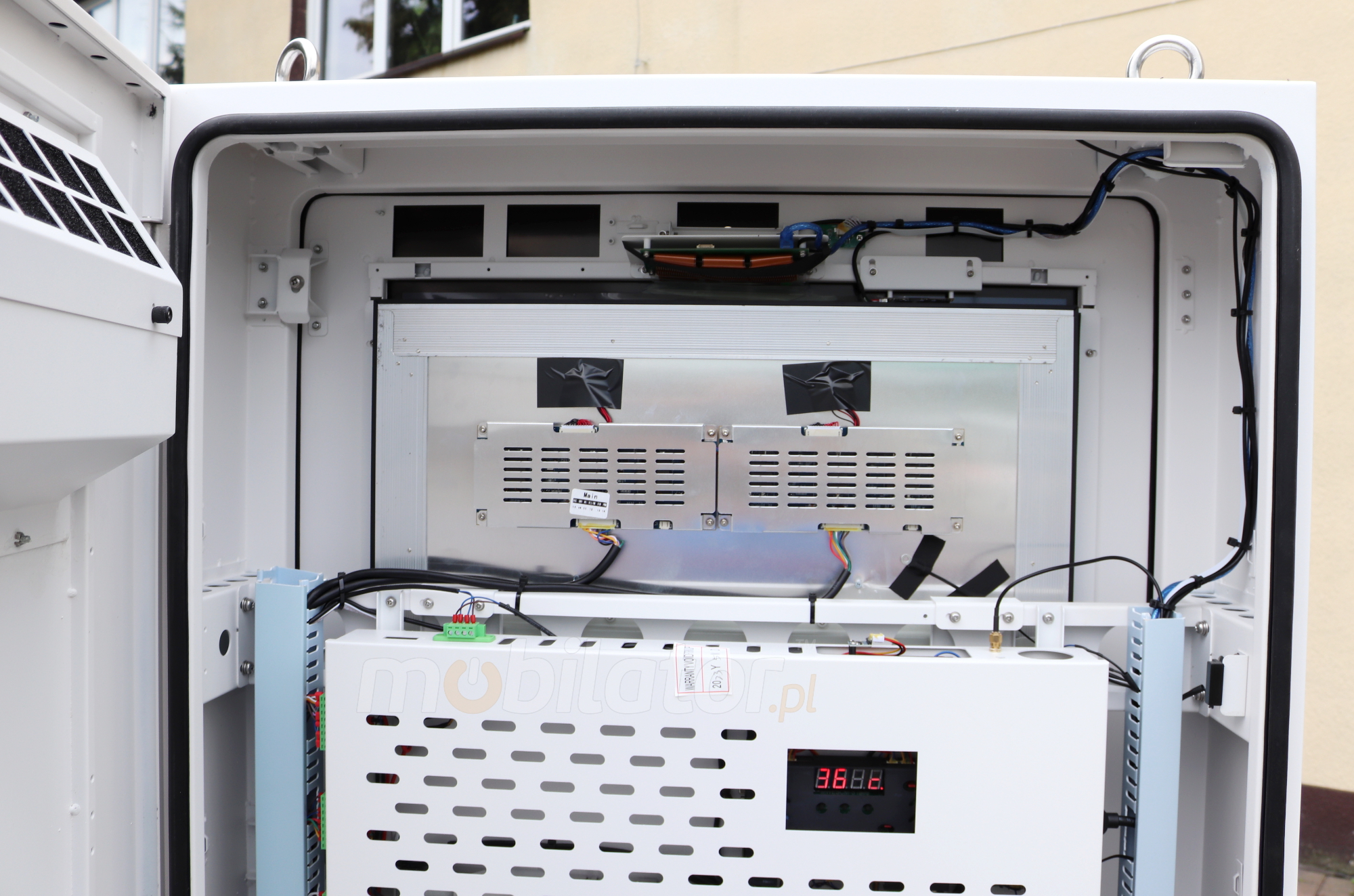A heat exchanger is installed in the device to cool the device at high temperatures, so that the outdoor totem can function in heat and sun. The cooling system allows the display to work properly in summer and the ads will be visible. For example, if the device starts to heat up to 60 ° C is a mounted fan, by increasing the speed of rotation, the totem will cool down to a temperature below 50°C, thanks to which the device will be able to function properly.