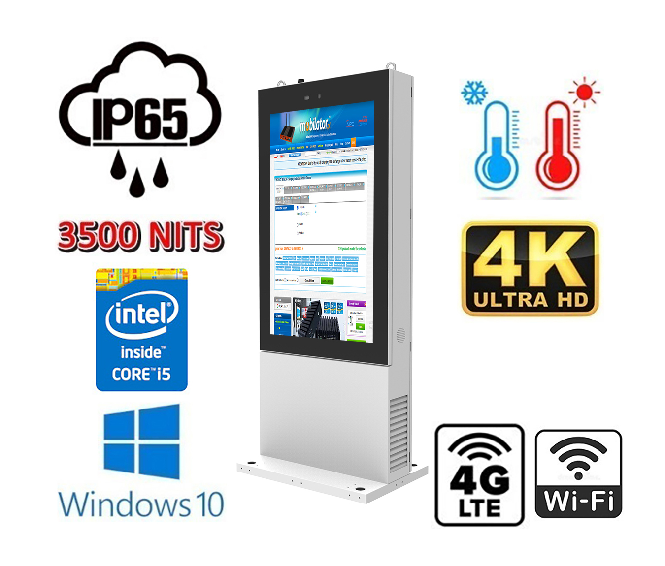 NoMobi Trex is adapted to continuous operation both at very low and high temperatures in the range from -20 ° C to 50 ° C. If the device is turned off, it can cope with temperatures ranging from -20 ° C to 60 ° C. In addition, the durable LCD totem is perfect for conditions with increased humidity, ensuring proper functioning even in the case of 90% relative air humidity.