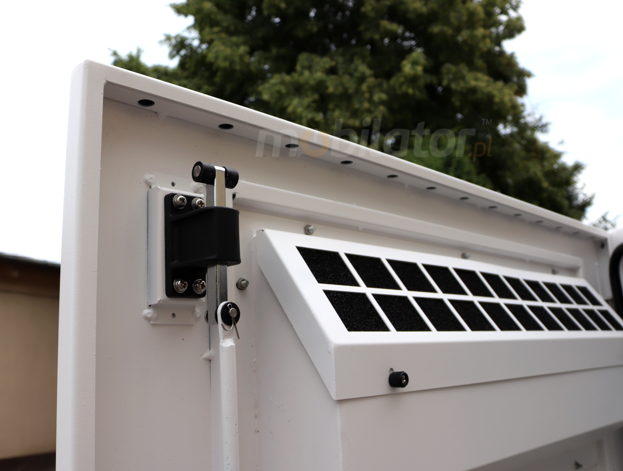 The outdoor standing totem has an anti-theft lock inside the device. In addition, the panel is screwed through the support to the base with screws, preventing quick disassembly. In addition, the device is equipped with a special alarm.