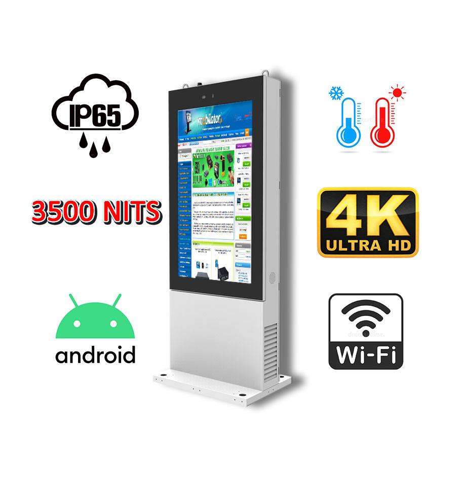 NoMobi Trex Hi55 v.2.1 - reinforced outdoor totem for use at trade fairs - with an LCD screen with a brightness of 3500nits and 4K resolution, with automatic heating ensuring operation at low temperatures