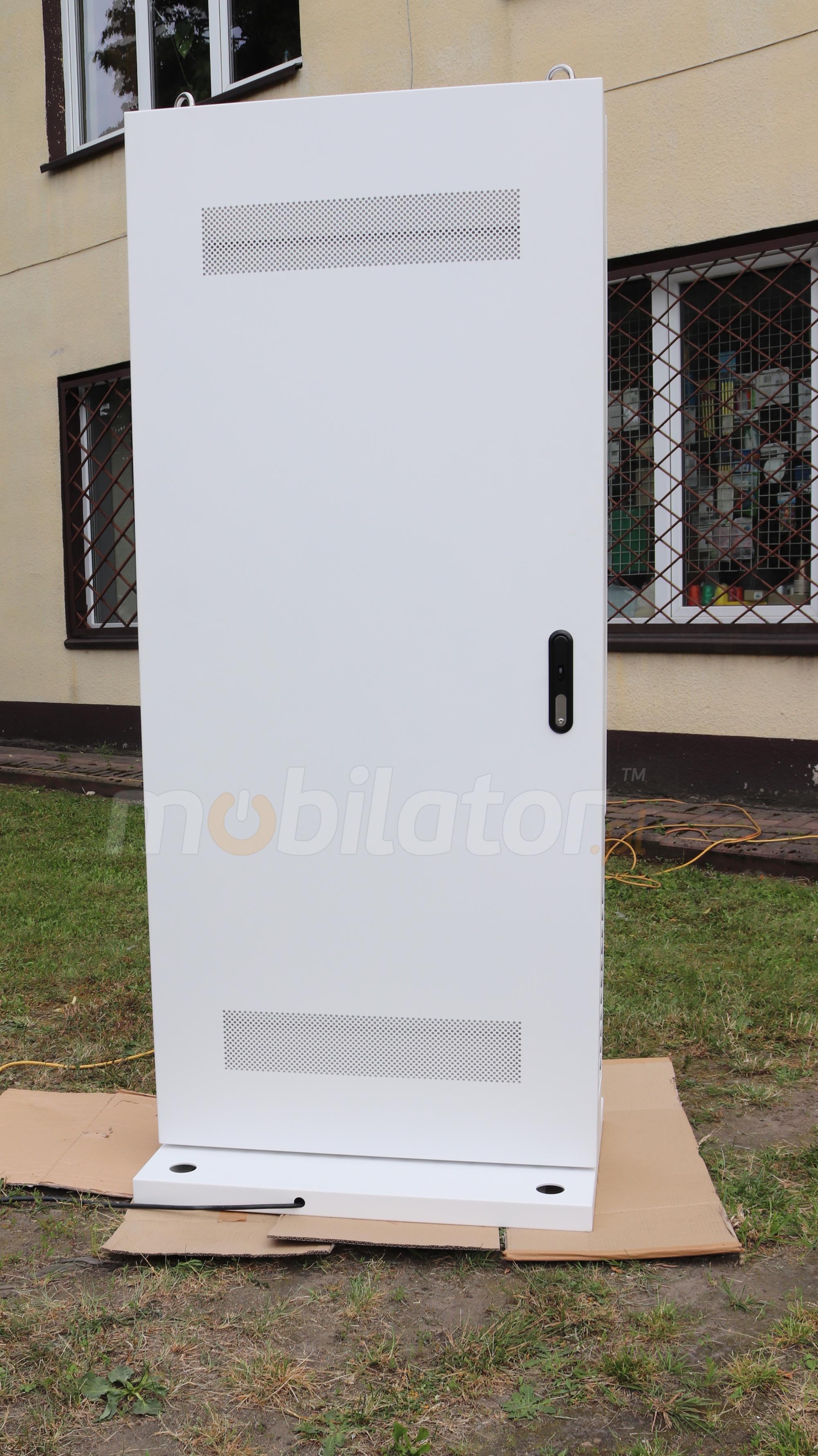 The outdoor standing totem has an anti-theft lock inside the device. In addition, the panel is screwed through the support to the base with screws, preventing quick disassembly. In addition, the device is equipped with a special alarm.