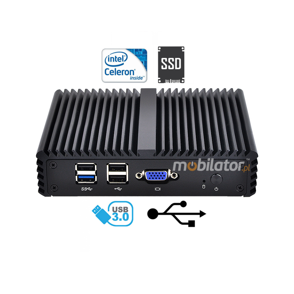 The industrial mini-computer mBOX-Q190G4N uses an efficient and energy-saving Intel Celeron J1900 processor. Inside it there are four cooperating cores enabling more efficient processing of many tasks at the same time. The shared cache memory in which the multilevel hierarchy is used is dynamically allocated to each processor core depending on the load. This reduces the average access time to the main memory.