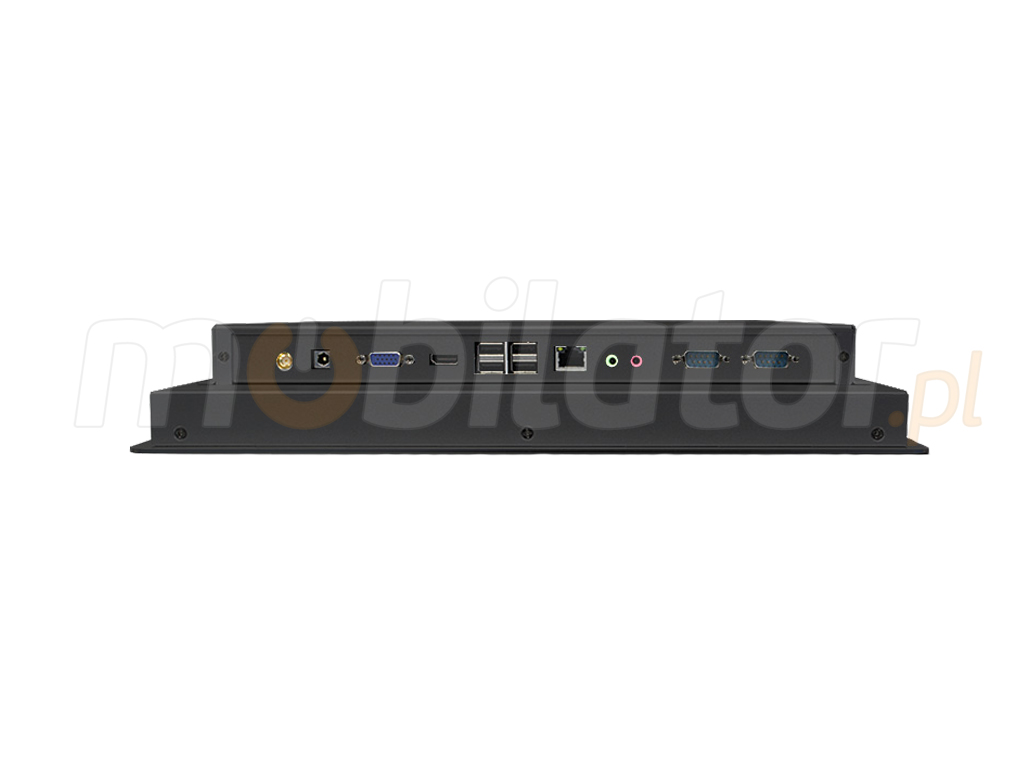 Integrated Intel RTL811E GigabitLAN 1xRJ-45, WIFI module allows you to connect the device to the network. The computer is equipped with: one LAN connector, two COM ports (RS232), one VGA, one HDMI output, four USB 2.0 ports, one audio out, one microphone input, and a power DC-in.