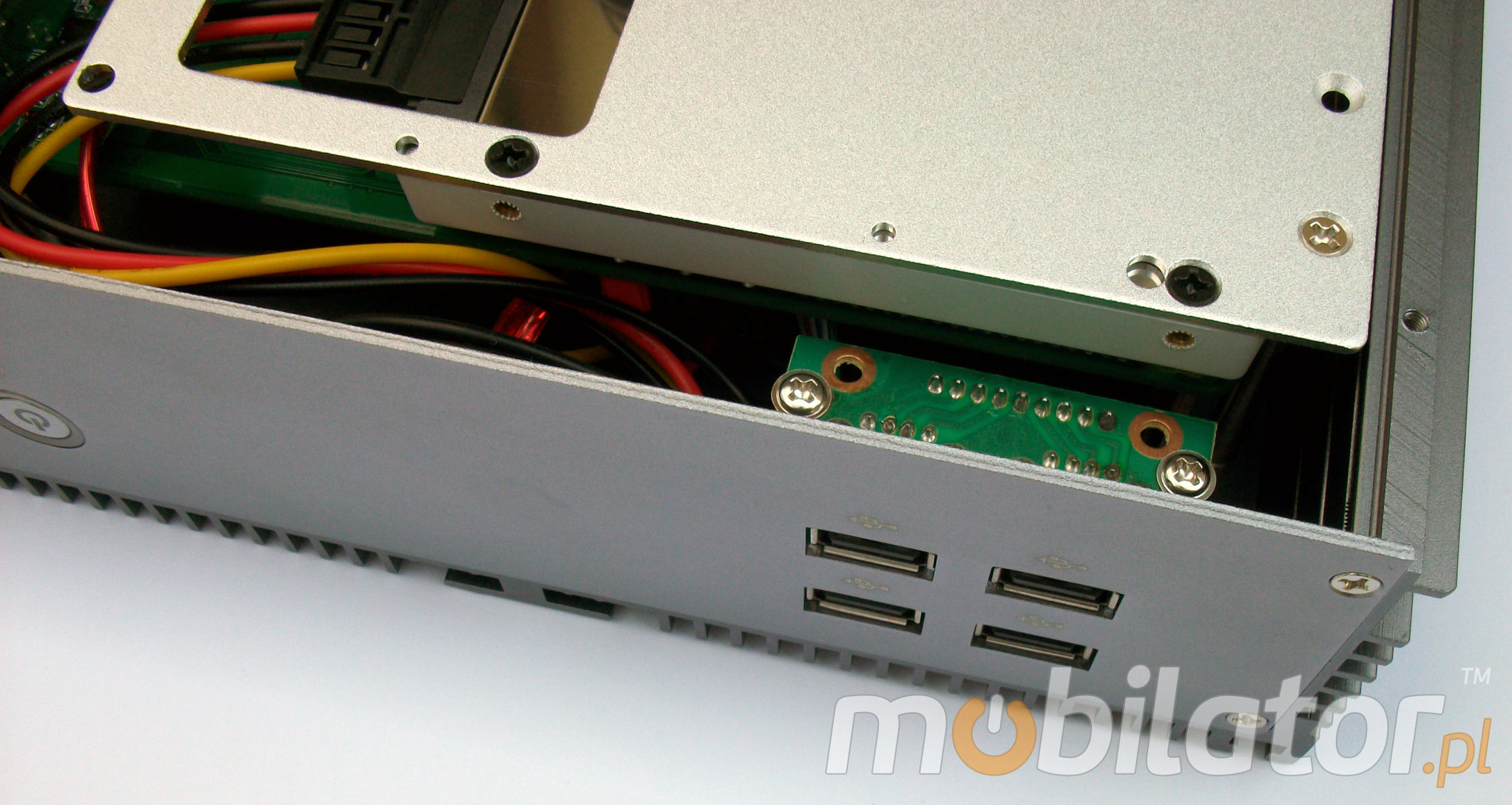 Integrated card - Intel RTL8105E 100M (optional WiFi module) allow connection to the network. The computer is equipped with: one LAN port, six COM ports (RS232) - in this can be 2x COM(RS422/485), one LPT port, one VGA output, eightUSB 2.0 ports, one way audio, one microphone input and connectors built into the motherboard: four USB 2.0 ports, two PowerOUT outputs, one audio output, one CPUFAN, one HDMI connector, one SIM connector, one JVGA connector, one LVDS connector, one GPIO connector.